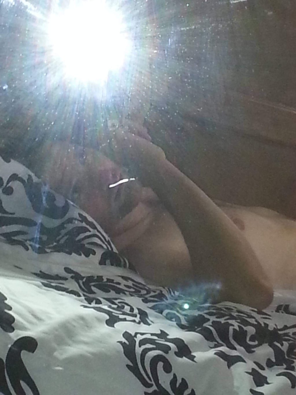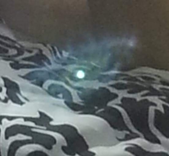 It was quite close to me. In the photo, which is actually a reflection from a full length mirror next to the bed, you can see the flash of the camera, the wispy little being with a central orb-core, and perhaps something strange going on with my nostril.
